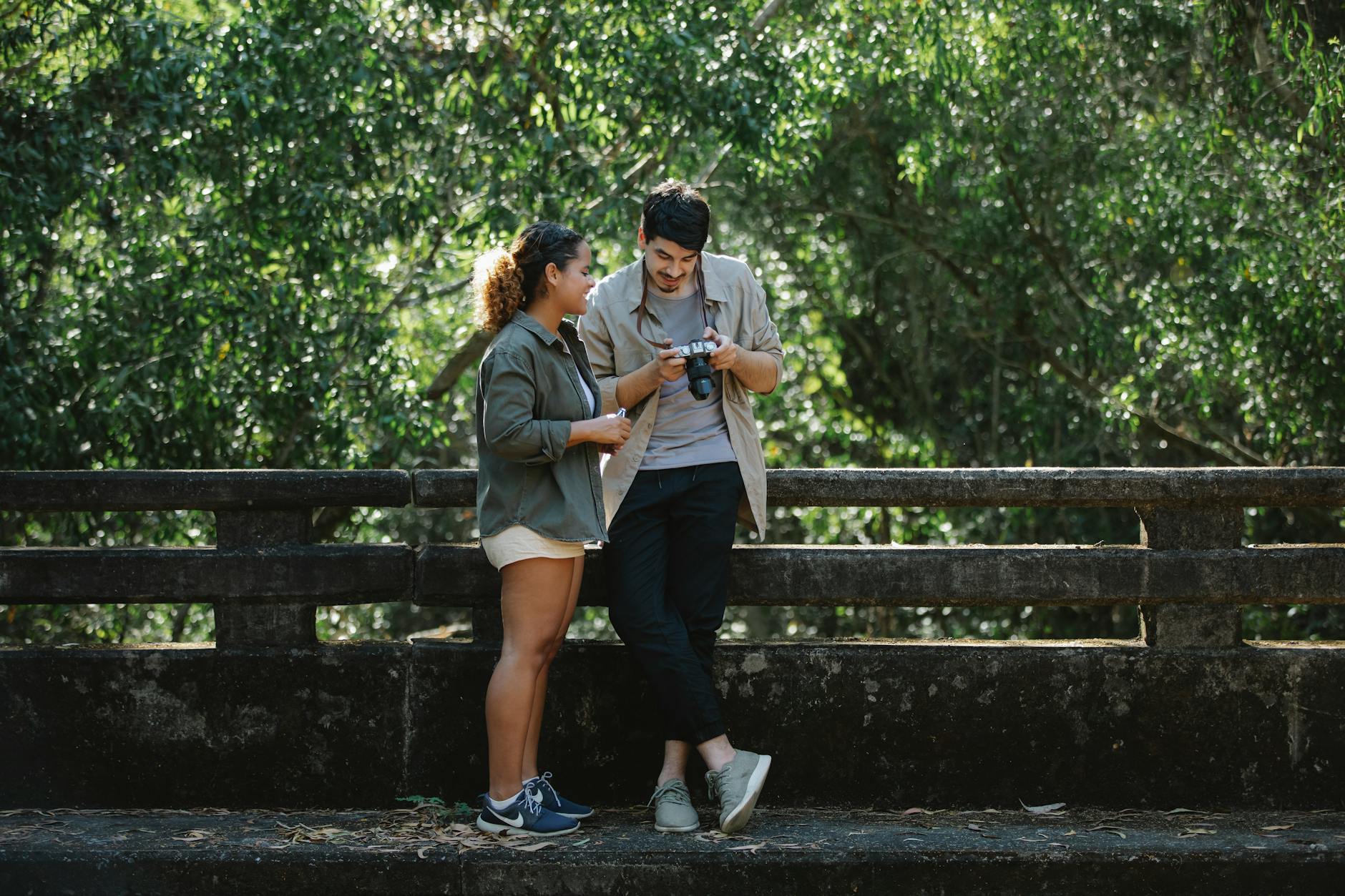 Full body smiling diverse couple in casual wear with photo camera standing near fence on wooden footbridge in park (Photo by Uriel Mont)